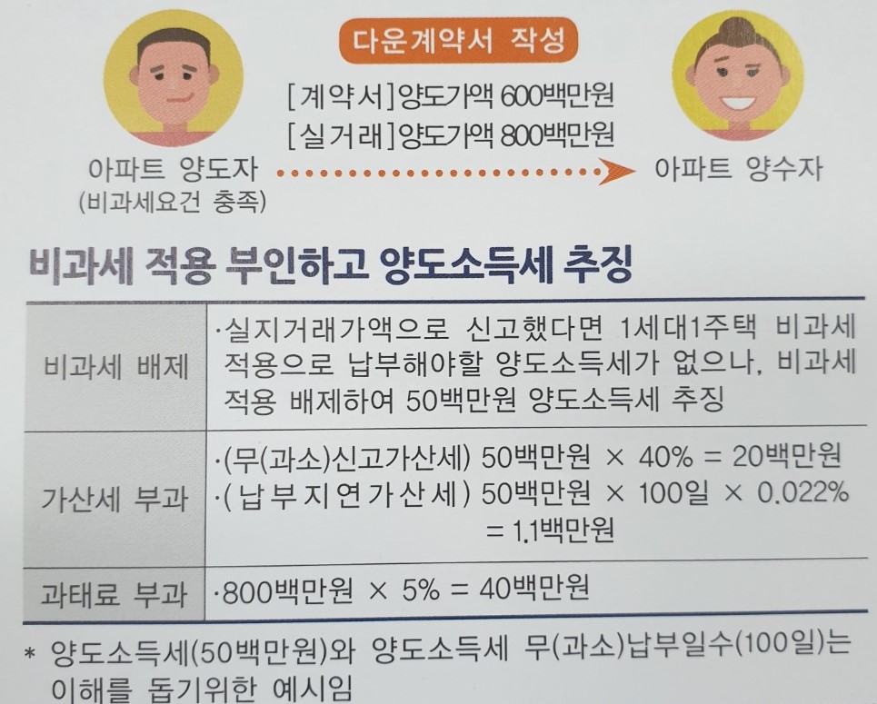 아파트 소유주가 해당 아파트(취득가액 500백만 원) 양도 시 실지거애가액 800만 원으로 거래하였으나 600만 원으로 계약서를 작성 후 양도소득세 신고한 사실이 확인될 경우
