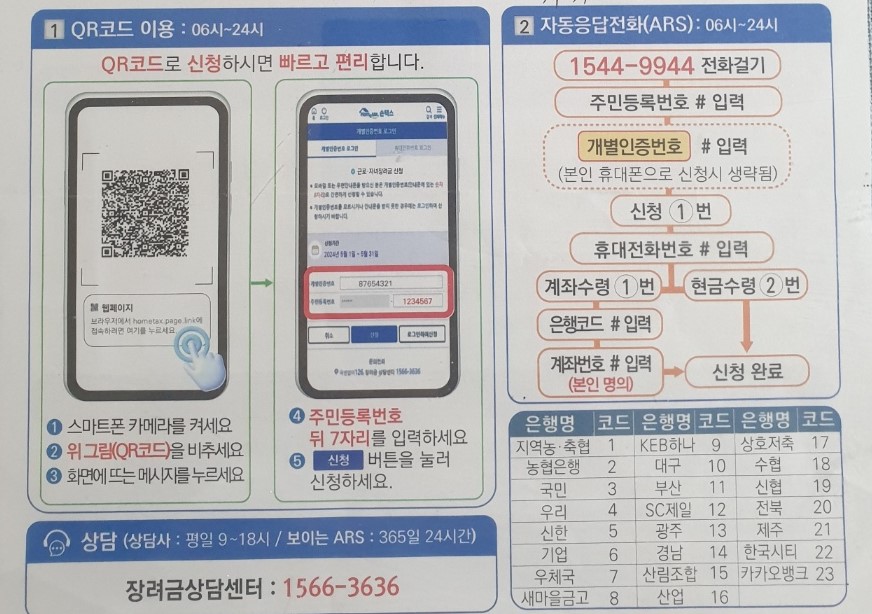 신청하기 전에 주민등록번호와 해당자 본인은행계좌를 준비하고 1544ㅡ9944로 전화해서 안내에 따라 입력하면 되는데 개별인증번호 가 안내문에 있으니까 꼭 본인이 아니더라도 위의 3가지만 정확히 알고 있으면 누구라도 대신 신청하실 수 있습니다